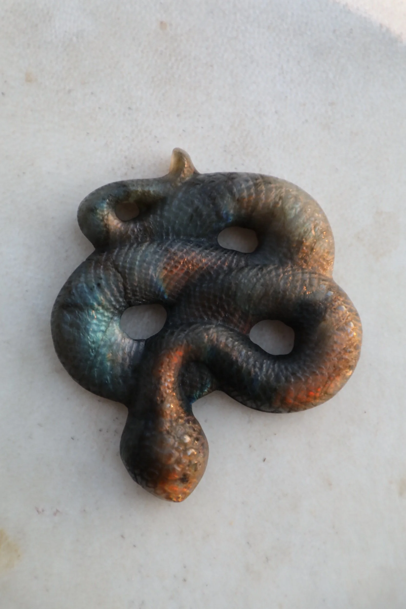 This Serpent is crafted with labradorite, connecting us to our intuition and our emotional cycles- just like the ocean- the waves of our emotions ebb and flow. This serpent reminds us to be open to solutions and outcomes we haven’t thought of yet. To keep our horizons broad and to humbly step into our mystic energy, calmly searching for the truth- only To find it and seamlessly incorporate the new layer of truth into our being.